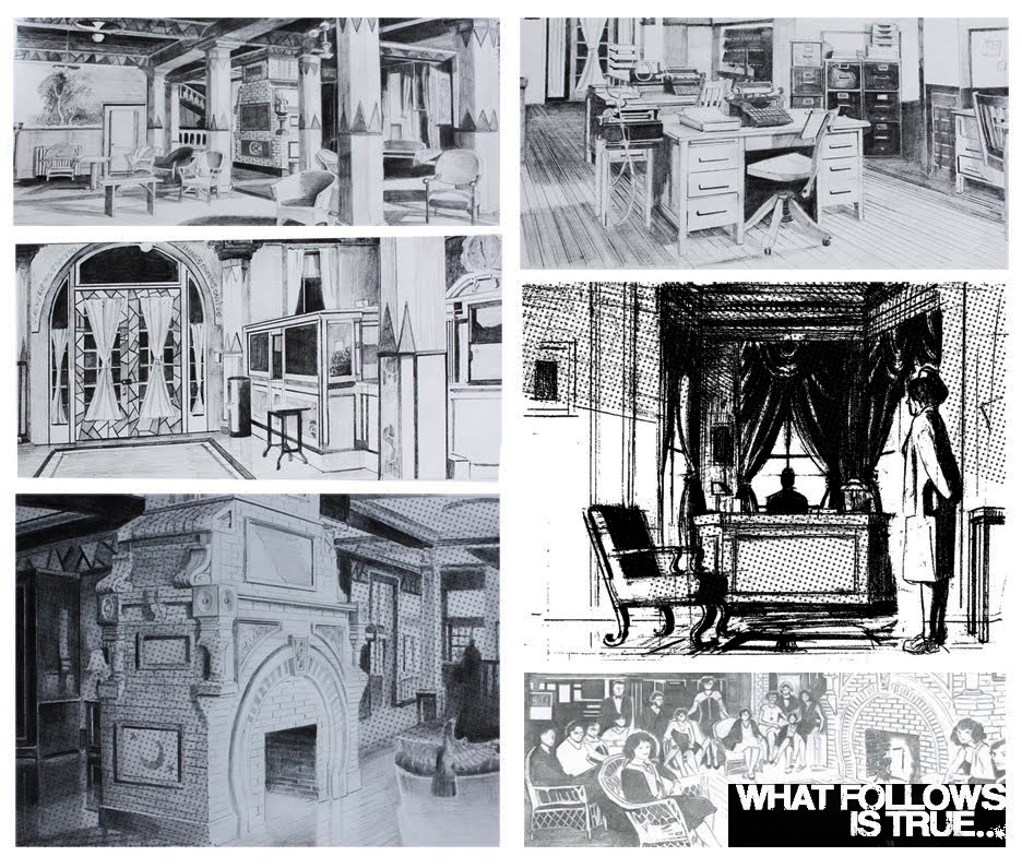 These images are preliminary drawings I made of interiors of the hotel as it was during the Baker years. A great deal of research is involved in faithfully representing this late nineteen thirties converted hospital. Because of the heinous events that took place between these two years, Baker saw to it that there was not much photographic documentation of the buildings interiors. However, through much persistence, I've been able to locate the necessary information and visual references from town historians, old newspapers, the library, historical society and the hotel itself to faithfully tell this very dark chapter of Arkansas history in a graphic novel format.